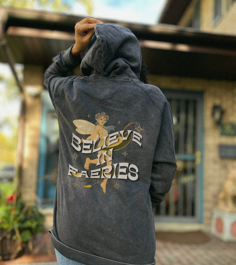 Featuring a beautiful design inspired by myths of the fae, this t-shirt is sure to appeal to fans of mythical aesthetics. Whether you're a lover of all things fae or just appreciate the beauty of mythical creatures, why not add a touch of magic to your closet with our Believe in Faerie hoodie!
