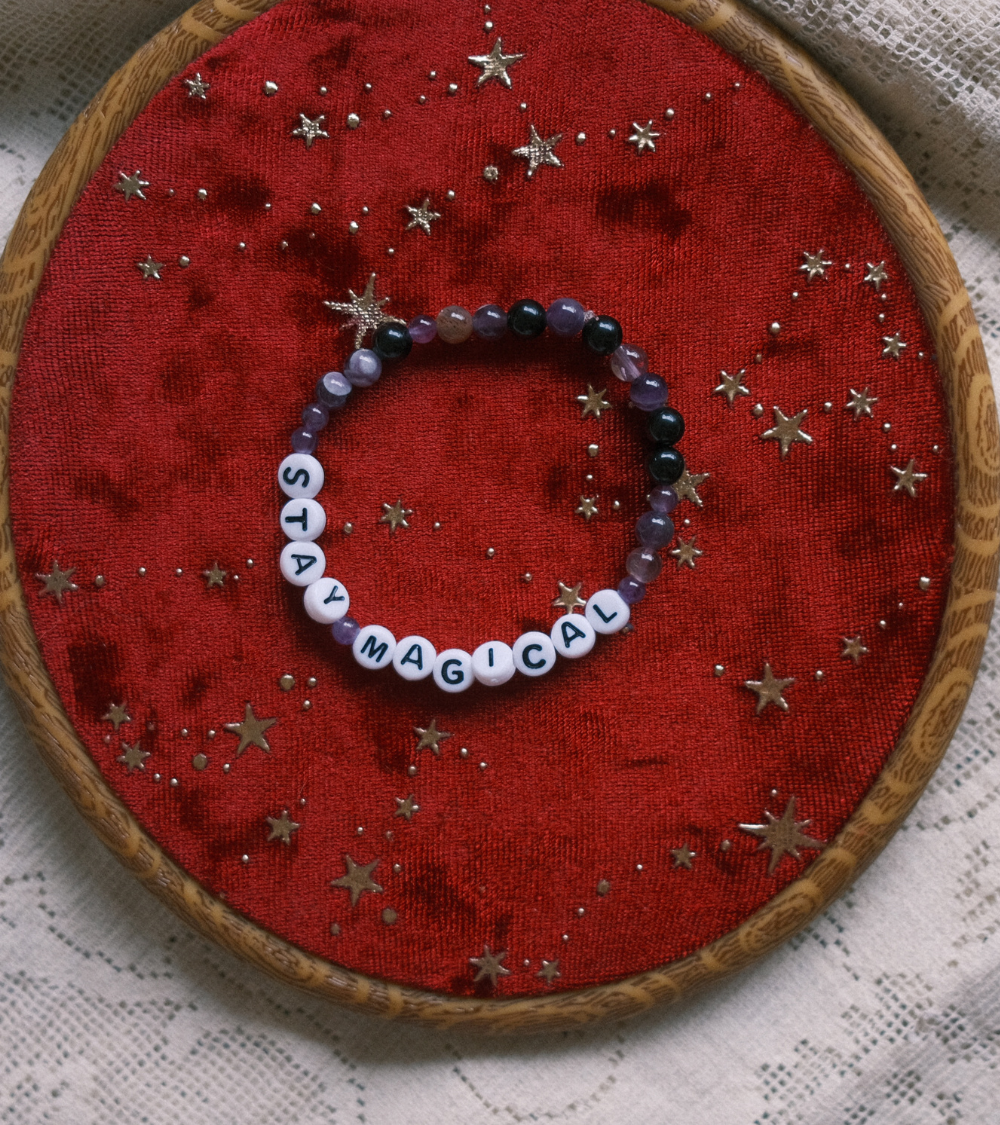 *Stay Magical is made with Natural sage Amethyst and Obsidian. Obsidian is a highly-regarded protective stone, known for its ability to block, absorb, and transform negative energy. Amethyst is a protective stone that helps to relieve stress and anxiety in your life, and the symptoms that accompany it, namely headaches, fatigues, and anxiety. Obsidian is believed to be a stone of clarity, with the ability to release emotional, physical, and spiritual blockages, drawing out stress and tension.