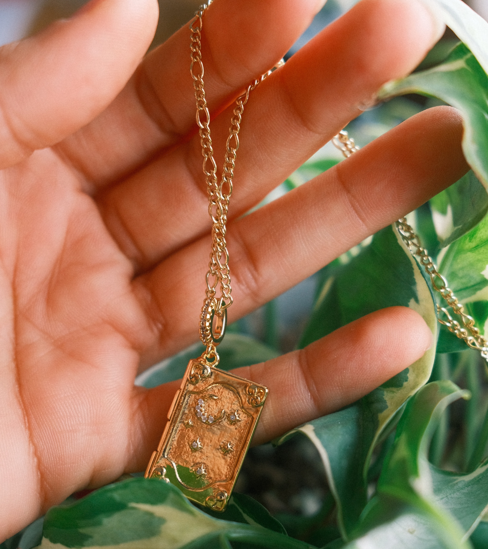 Care Instructions: To preserve the magic, handle your Bookish Locket Necklace with the same care you handle your most cherished books. Avoid exposure to harsh chemicals and moisture, remove before engaging in activities that may cause friction, and clean gently with a soft, lint-free cloth. Store your pieces in a dry place, away from abrasive surfaces.