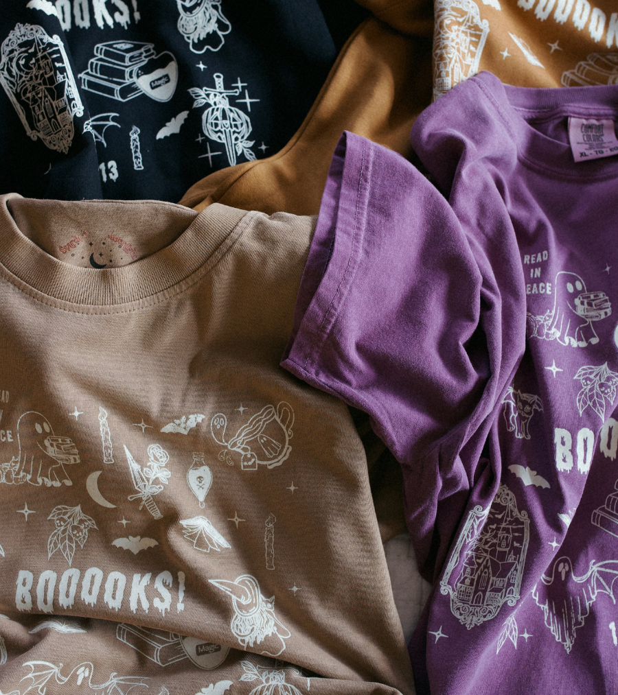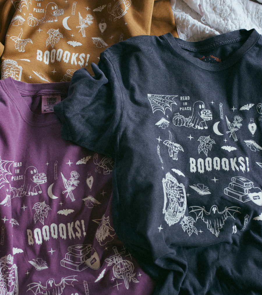 Calling all romantasy and fantasy romance readers—get ready to add some spooky flair to your wardrobe! Our BOOOOKS! Spooky Tee is the perfect blend of spooky Halloween vibes and bookish magic, designed especially for those who love diving into worlds of adventure, magic, and romance. Featuring a ghost carrying a stack of beloved novels, enchanted bats, gothic castles, and witchy bookish elements, this shirt is a must-have for anyone who enjoys escaping into a good fantasy romance book during the cozy autumn months.