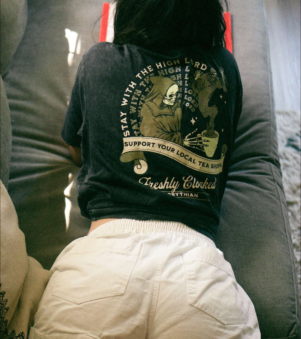 Featuring a pocket and back graphic design inspired by The Suriel and the first time meeting Feyre Archeron where he tells her to stay with the high lord. This t-shirt also features a fandom reference of how the Suriel loves to spill the tea, but only to our girl Feyre, making this shirt a must-have for any ACOTAR fan.