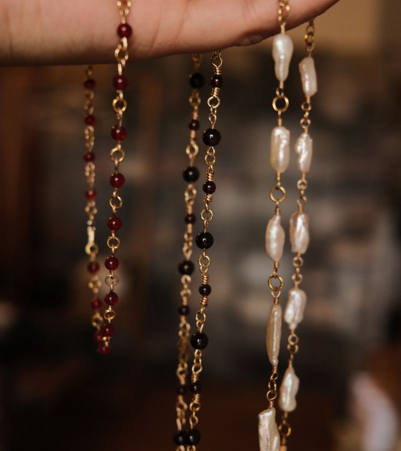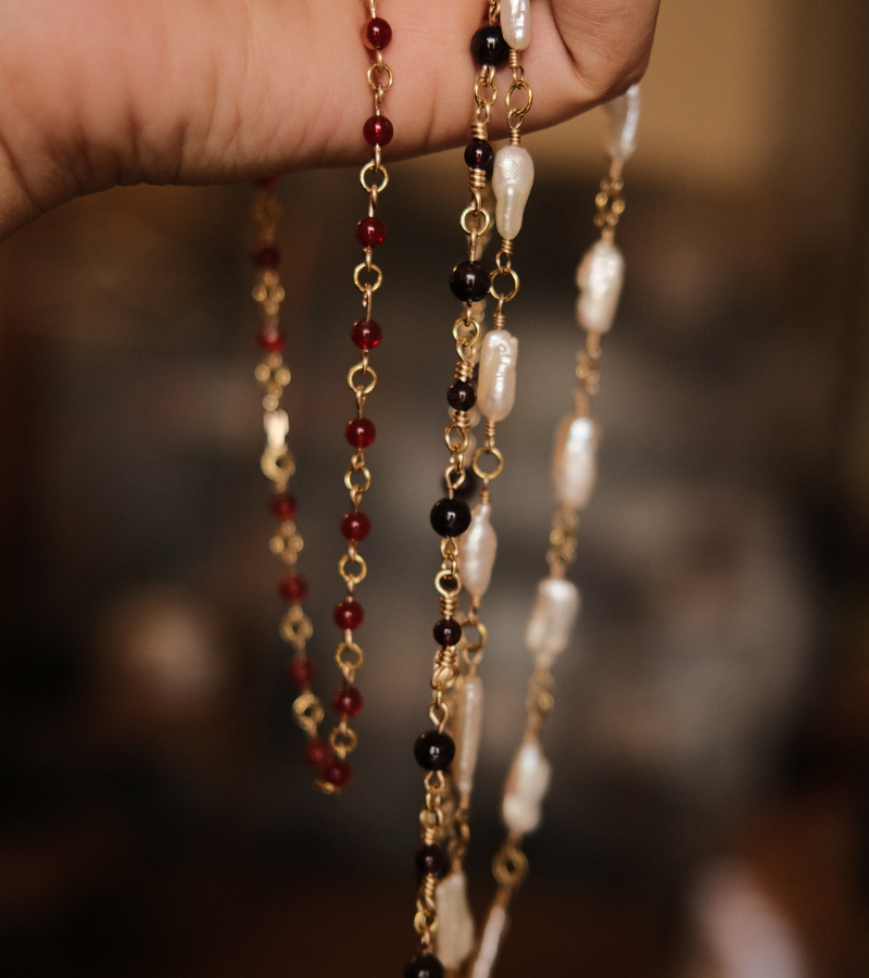 • Gold-filled wire-wrapped Red Agate, Garnet, and Freshwater Pearl