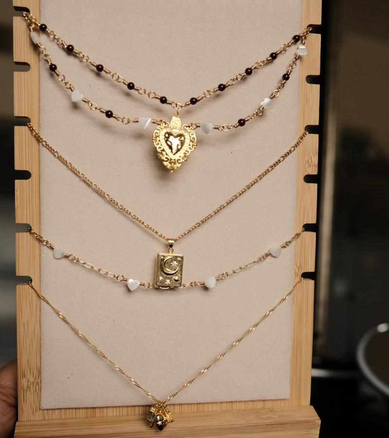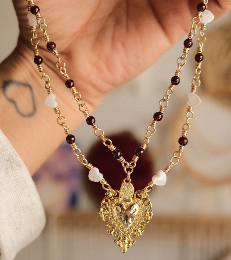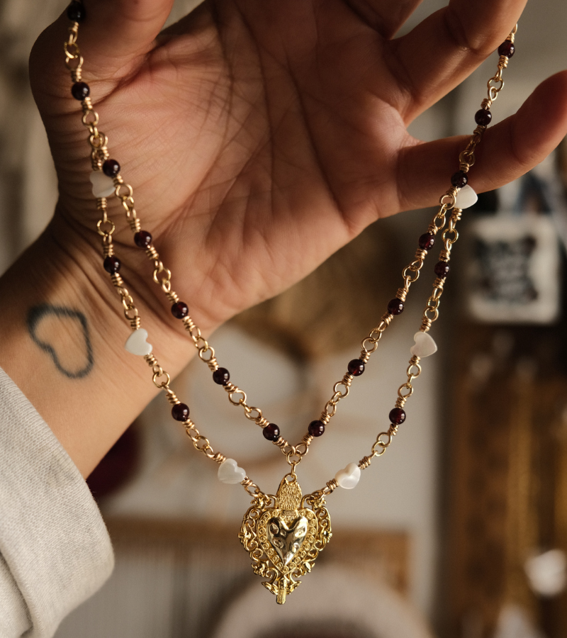 At its center, an ornate gold filled sacred heart pendant radiates energy, a reminder that love, whether for oneself, another, or the world - is the most powerful force of all. This piece is an ode to the heroines of great love stories, the kind that are both soft and unyielding, filled with magic and mystery.