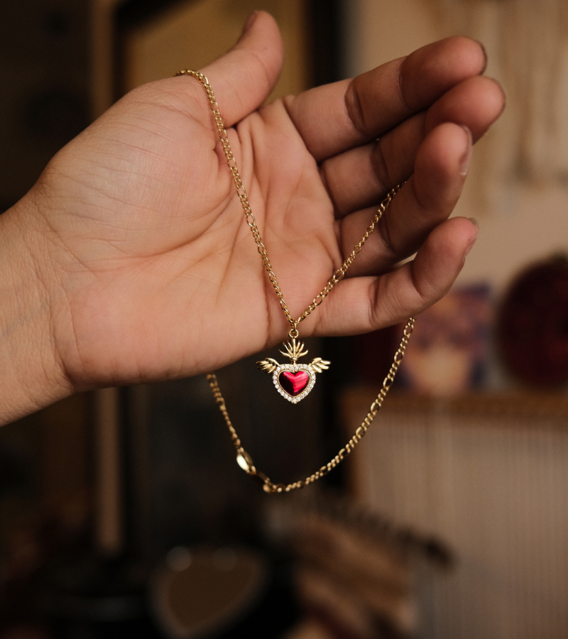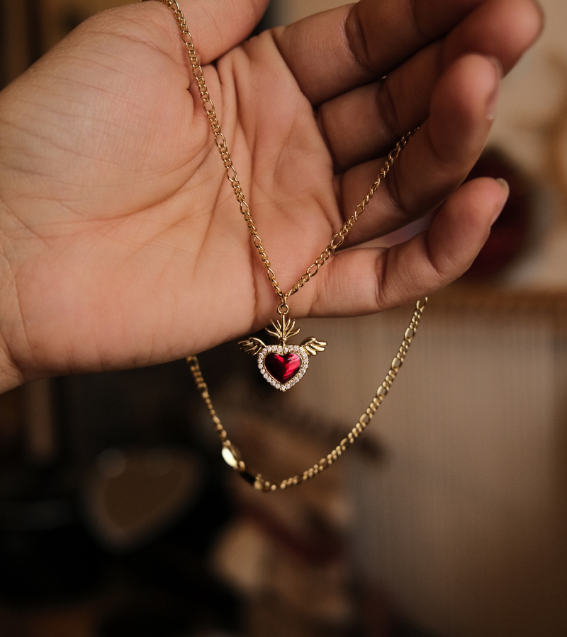 The Sacred Heart Necklace feature a deep red faceted heart framed in gold with delicate crystal accents, this piece radiates intensity and elegance. The winged flame motif represents a love that transcends time, one that is both ethereal and unbreakable.