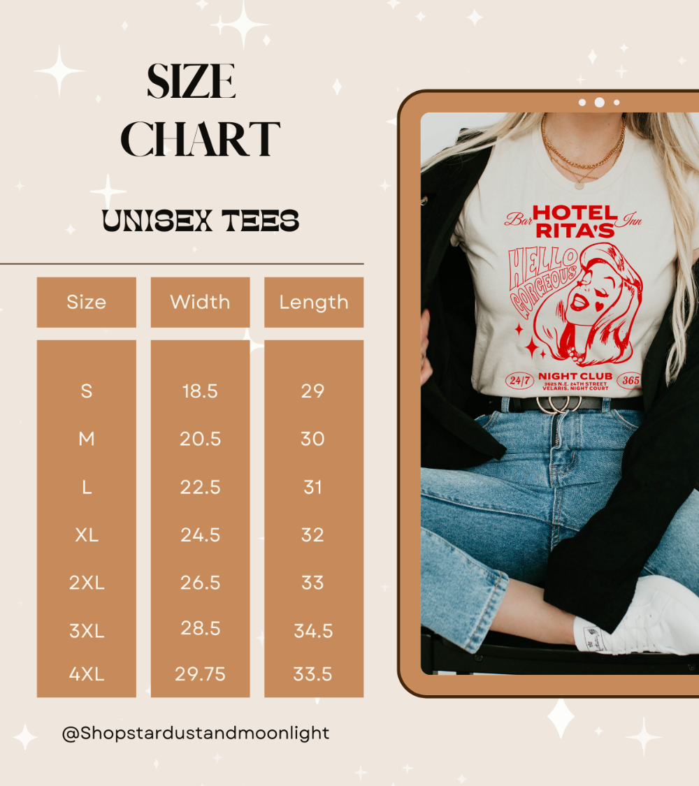 *Please note that in an effort to be inclusive to all magical babes we use a variety of premium vendors for our merchandise so some slight color variations might occur if ordering size 4X. It is highly encouraged to measure the shirts you currently own and reference the size chart to see what you you will feel most comfortable in.