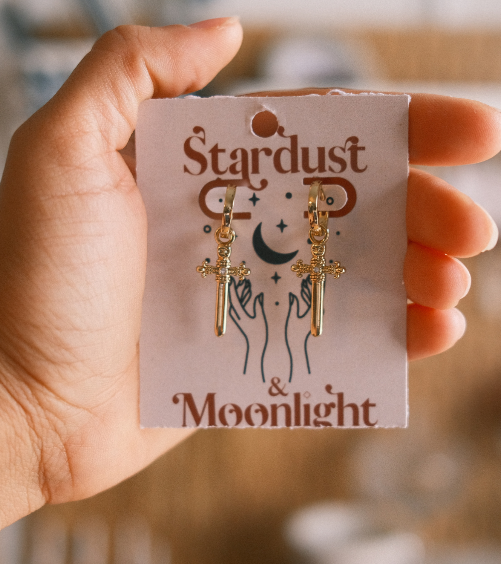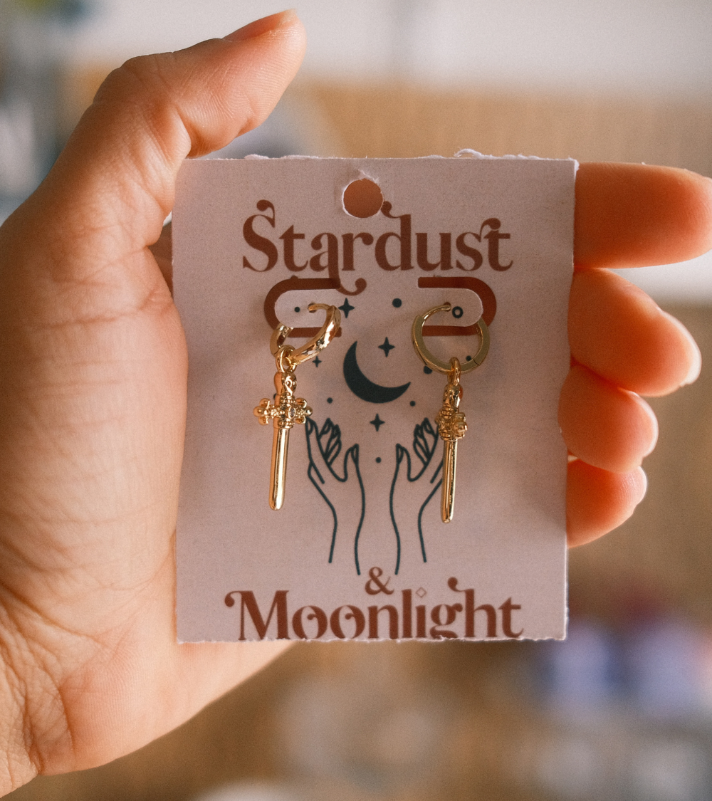 Whether you're a devoted reader of fantasy romance or simply seek a touch of daring elegance, the Twin Dagger Huggie Earrings are inspired by the daring spirit of fantasy romance heroines, these earrings are a symbol of strength, passion, and the untamed beauty found within the pages of your beloved novels. Let them be a silent declaration of the stories that captivate your heart and the strength that resides within—a perfect accessory for the bold and bookish soul.